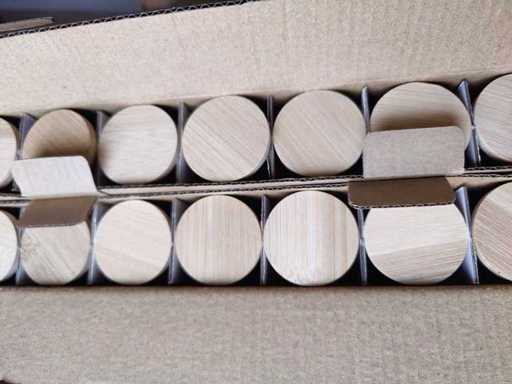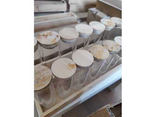 6 étagères doubles à épices (pour 14 bocaux) et 4 simples (pour 7 bocaux) avec 112 bocaux en verre.
