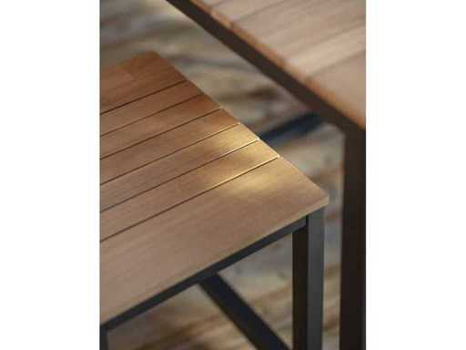 Table imperméable avec 2 tabourets assortis, en teck et aluminium.