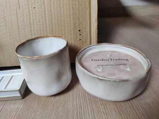 4 bougies dans un bol en céramique. 4 distributeurs de savon. 7 gobelets de brosse à dents. 8 porte-savon 7 pots de fleurs Tout est en céramique.