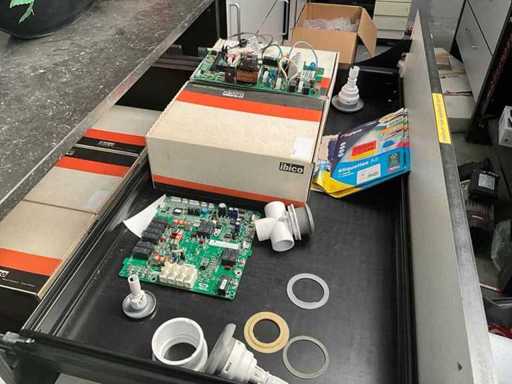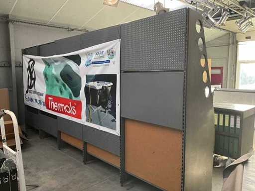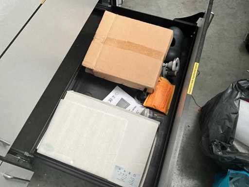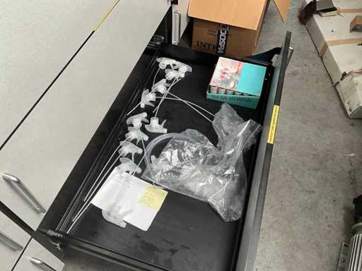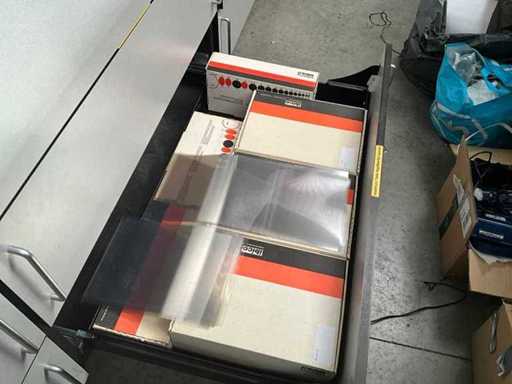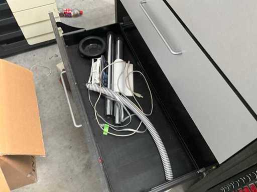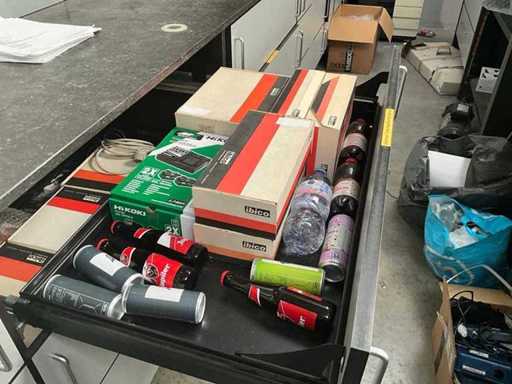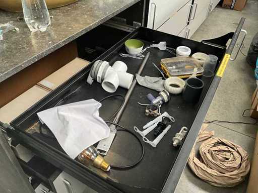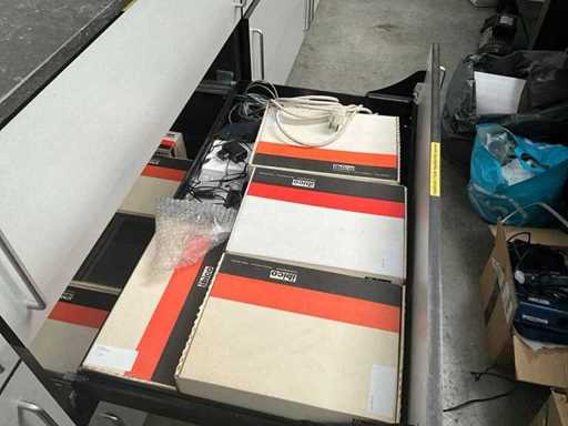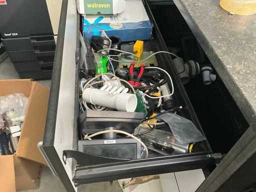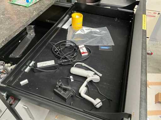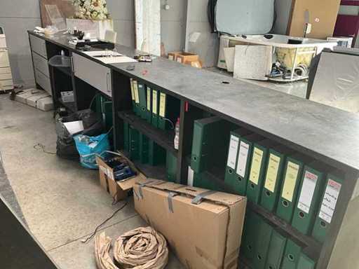Composé d’un plan de travail avec 3 pièces en pierre bleue d’épaisseur supérieure de 3 cm avec 4 tiroirs et compartiments, + commode assortie de 5 mètres de longueur avec 15 tiroirs et un dessus en pierre bleue en 3 pièces d’épaisseur de 2 cm + mur arrière amovible, tabouret de bar +2x, tout avec du contenu