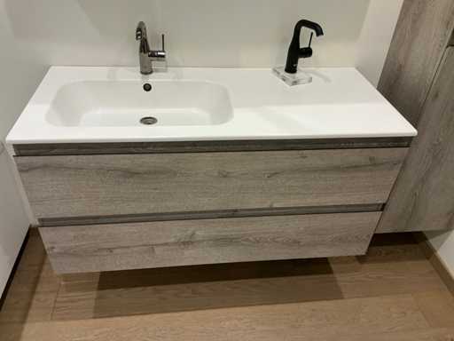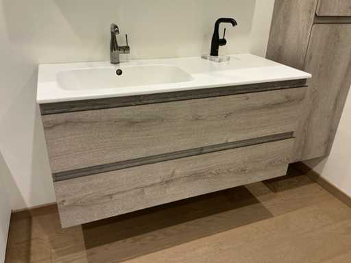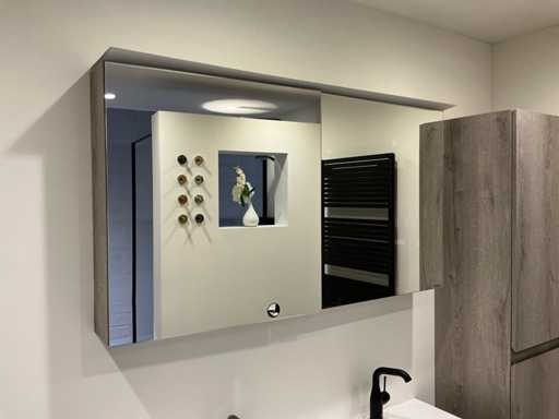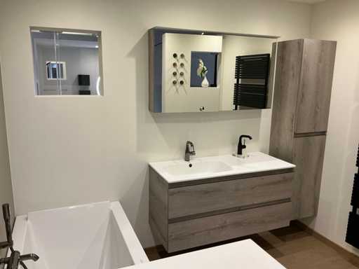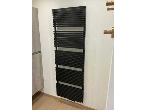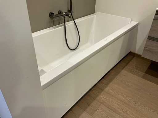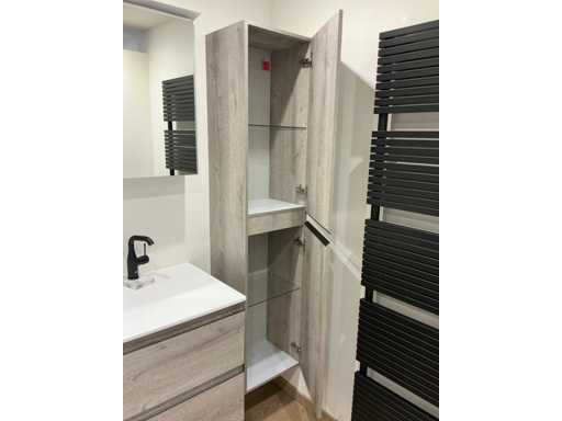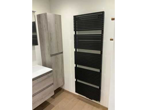Composé de : baignoire DURAVIT STARCK 1800x800x480mm, douche à l’italienne HUPPE avec receveur de douche Duravit Stonetto 120x90cm, WC suspendu VITRA METROPOLE, meuble de salle de bain avec lavabo S&S 120x52cm, meuble colonne S&S 40x35x175cm, radiateur mural design VASCO 60x175cm et armoire de toilette LED SANIJURA 120x15x66cm