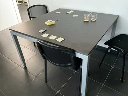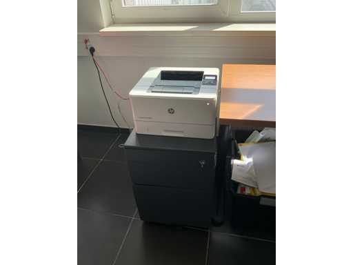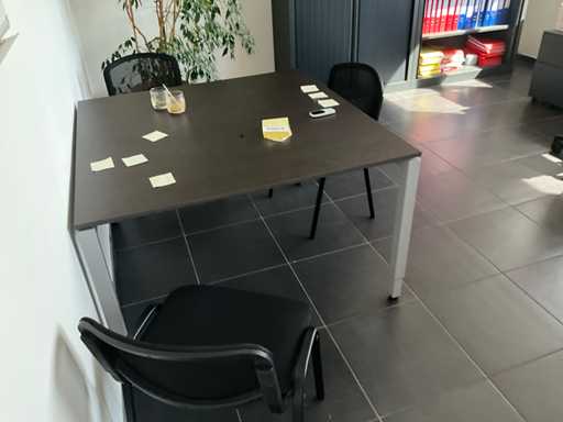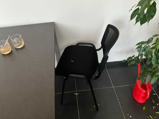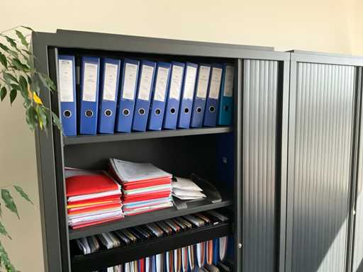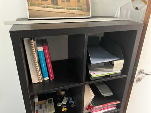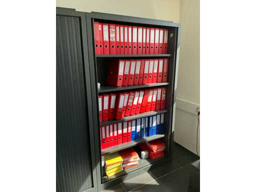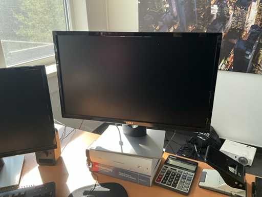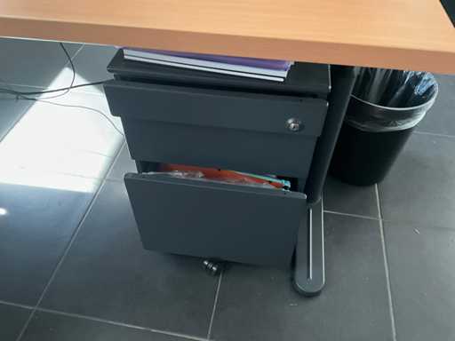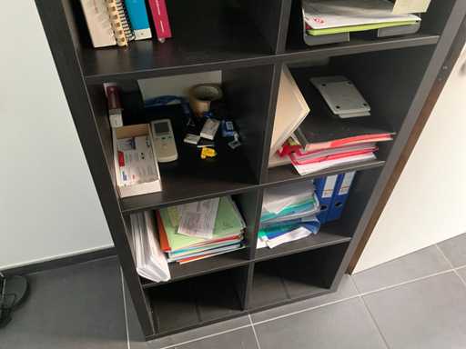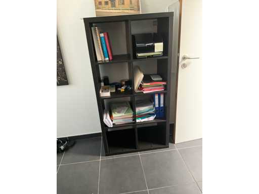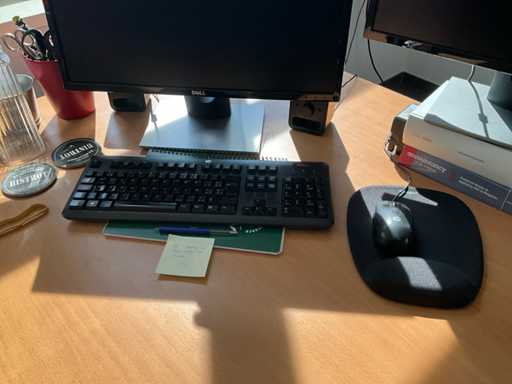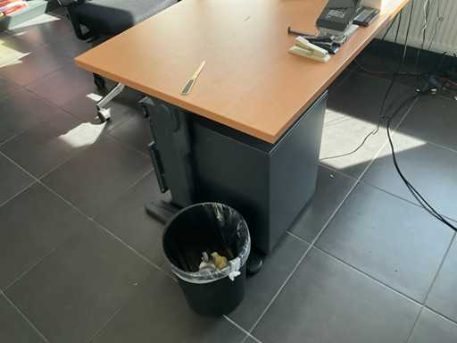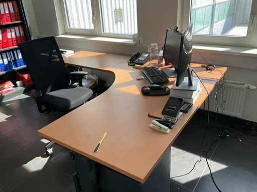 Composé d’un bureau d’angle avec base en métal et plateau en bois avec dimensions : 180x220x72cm, chaise de bureau, 3x chaise d’appoint avec siège en tissu, 2x classeur avec dimensions : 120x43x197cm (clé non présente), 2x moniteur DELL, imprimante HP, clavier et souris HP, 2x armoire en bois pour tableau blanc avec 8 compartiments de rangement ouverts, table en métal réglable avec base en métal et plateau en bois avec dimensions : 120x120x73cm, quelques fournitures de bureau, 2x bloc-tiroirs mobile avec 4 tiroirs, SAUF téléphone BELGACOM, classeurs SANS contenu, livraison selon les instructions