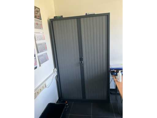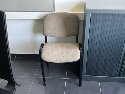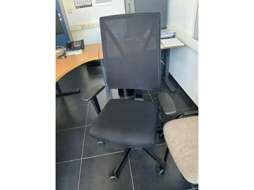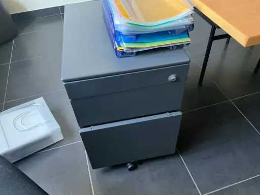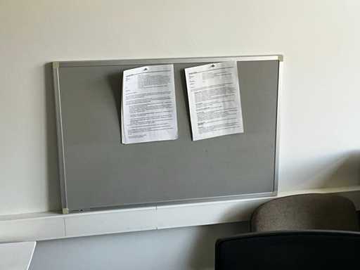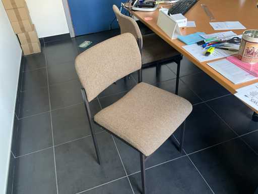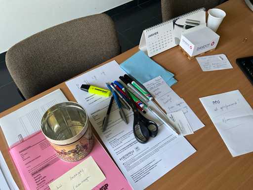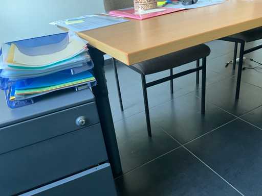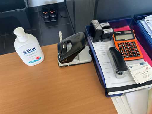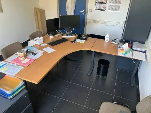 Composé d’un bureau d’angle avec base en métal et plateau en bois de dimensions : 180x220x75cm, d’une chaise de direction, d’un bloc-tiroirs mobile avec 3 tiroirs, de 2x chaise d’appoint, de diverses fournitures de bureau, de 2x classeur avec dimensions : 120x46x94cm et 100x43x100cm, tous deux SANS contenu, SAUF moniteurs et téléphone BELGACOM, livraison selon instructions
