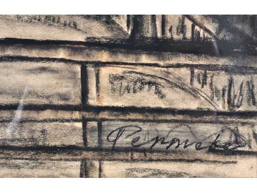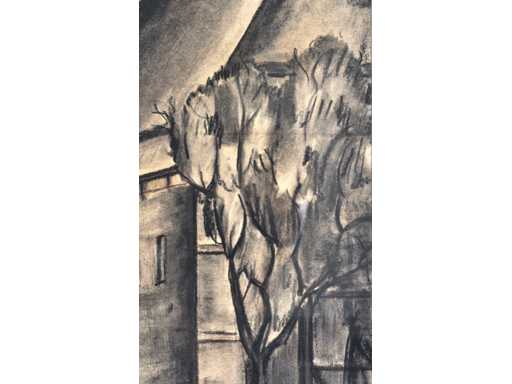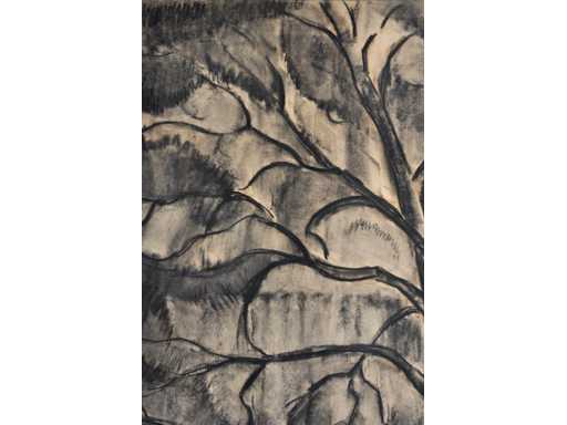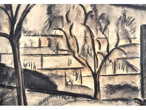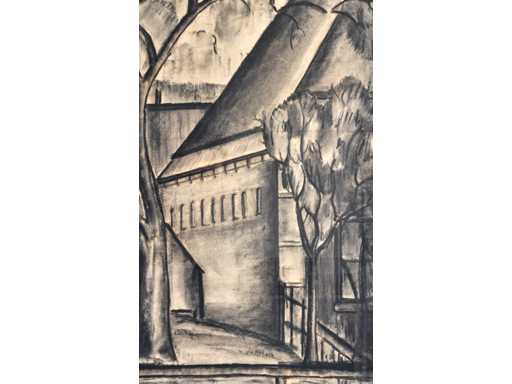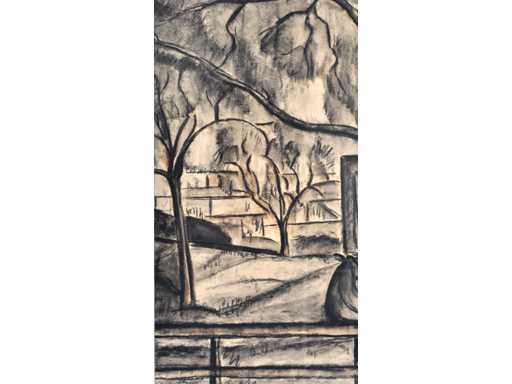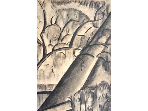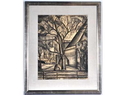 Constant Permeke - Ferme entre les arbres avec vache - Charbon de bois et craie rouge