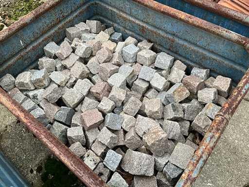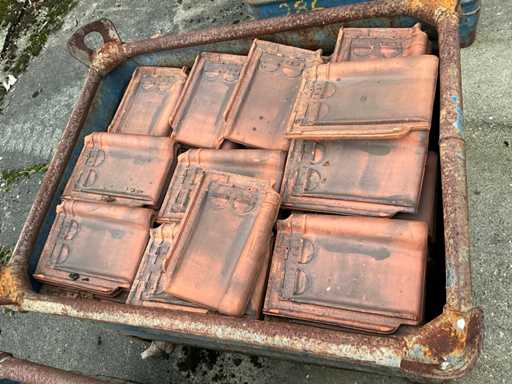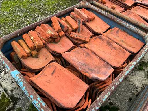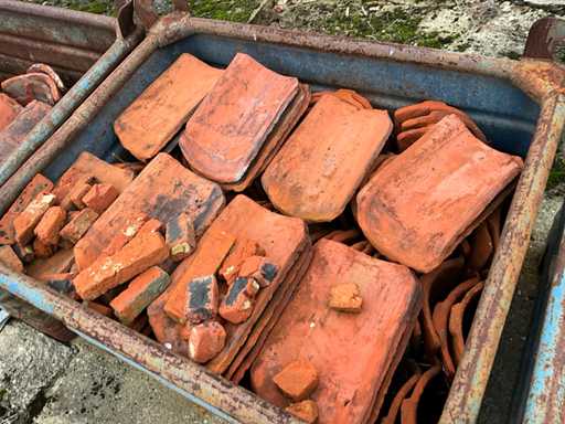 5 compartiments contenant diverses tuiles de toiture, 1 caisse contenant des pierres décoratives