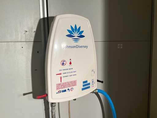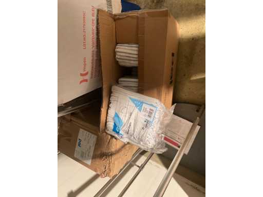 Contenu salle de nettoyage, composée du système de dosage JOHNSONDIVERSEY (démontage par l’acheteur), support mural en acier inoxydable (démontage par cuivre), 3 bacs en PVC sur étagère mobile, distributeur Fastfold TORK, papier toilette TORK, mouchoirs TORK, 2 porte-sacs poubelles, Charlottes, surchaussures, situé dans la chambre 74