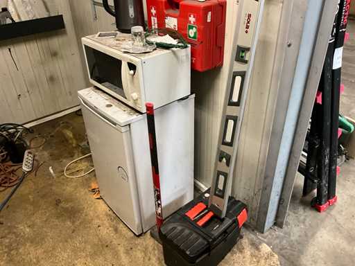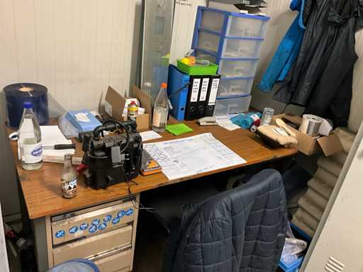 Composé d’une armoire de casier, d’un bureau avec chaise, d’un réfrigérateur et d’un micro-ondes, d’une pompe à eau B&D, de câbles d’extension, de bouilloires, d’un booster de démarrage Stanley, d’un Passat et d’une masse, d’une mallette de matériel, d’un matériel de premiers secours, etc.