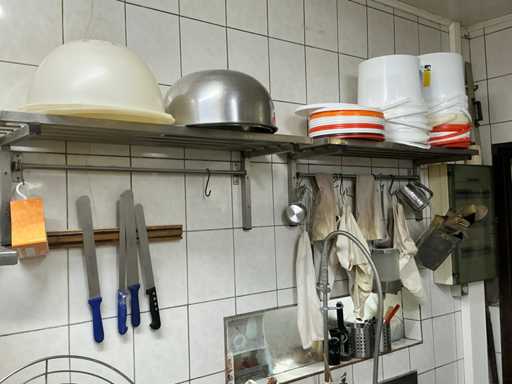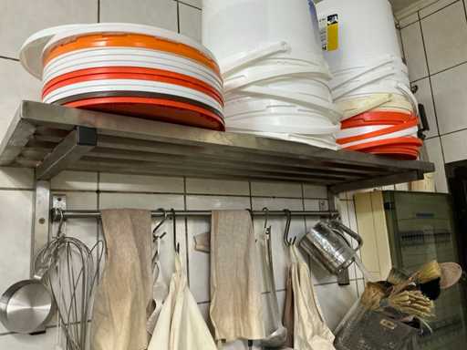 Avec plusieurs ustensiles de boulangerie, dont des anneaux de cuisson, des plats à pâtisserie, des coupe-pâte, des brochettes à pâte et quelques planches à découper,