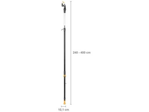 Plus de puissance moins d'effort : jusqu'à 6m de portée de coupe verticale. Manche extensible de 2,40 m à 4 m. Tête orientable (sur 230°). Capacité de coupe : 32 mm. Un support de lame pour une plus grande précision. Une poignée avec grip pour une meilleure prise en main et une sécurité accrue. Un système de réglage ambidextre. Une base élargie pour une meilleure préhension et un rangement facile. Un système de verrouillage renforcé.