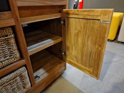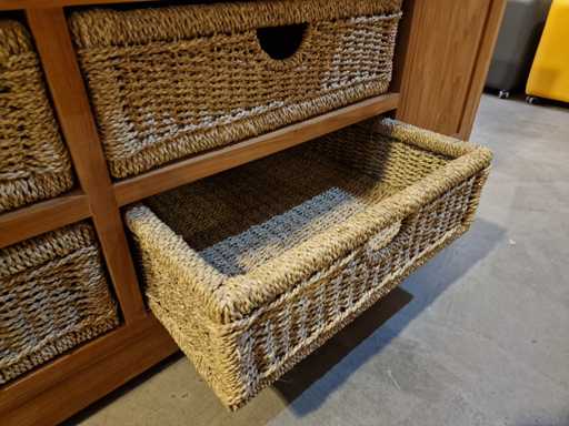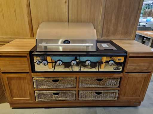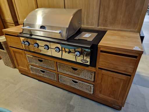 Cuisine extérieure de luxe en teck diamant 200 x 60 x H90cm sur roues avec 2 portes battantes + 2 tiroirs sans poignée + 4 paniers en rotin