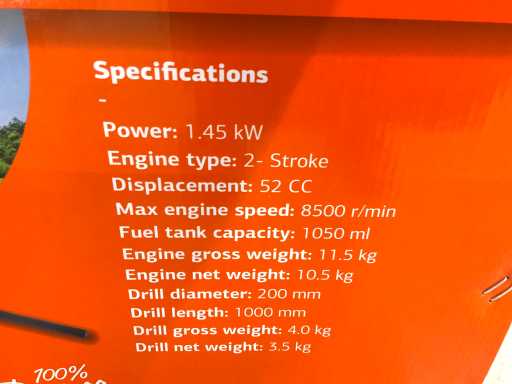 Longueur de perçage 1000mm ; diamètre du foret 200 mm ; capacité du réservoir 1050ml ; régime moteur 8500rpm ; 1,45 KW ; 2 temps ; 52 cm³ ; 6170