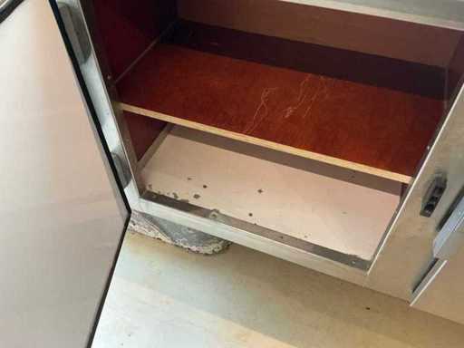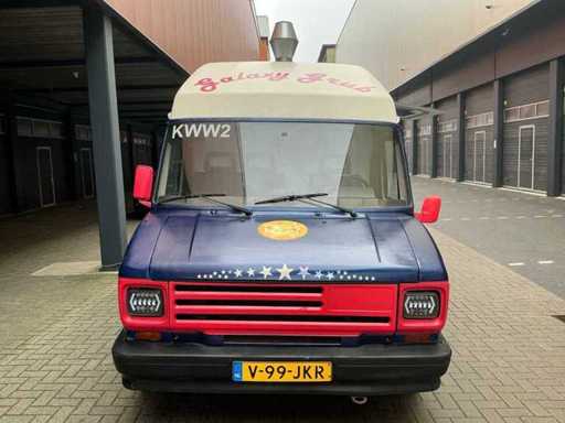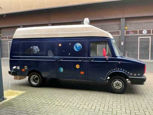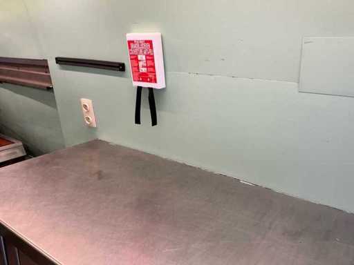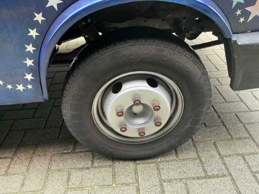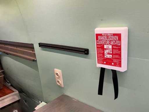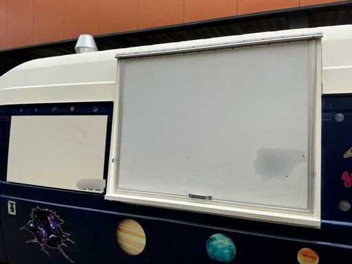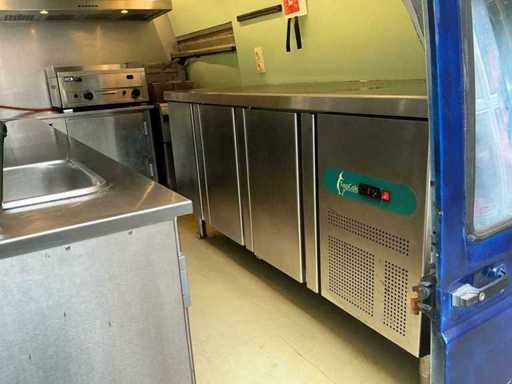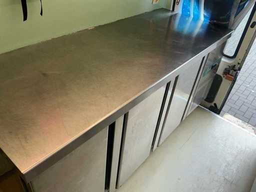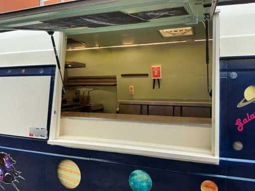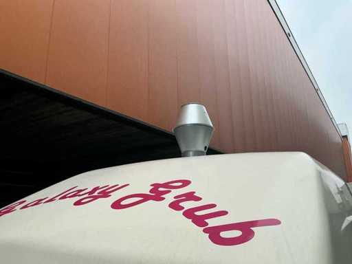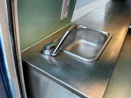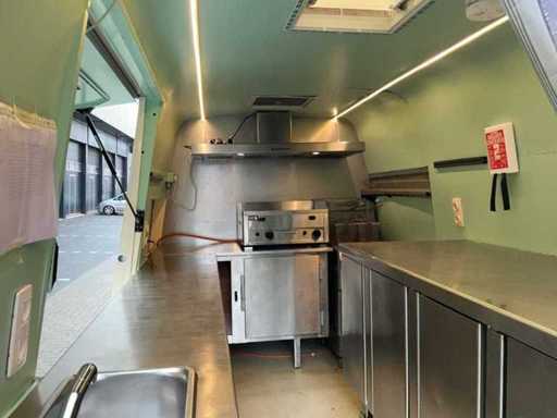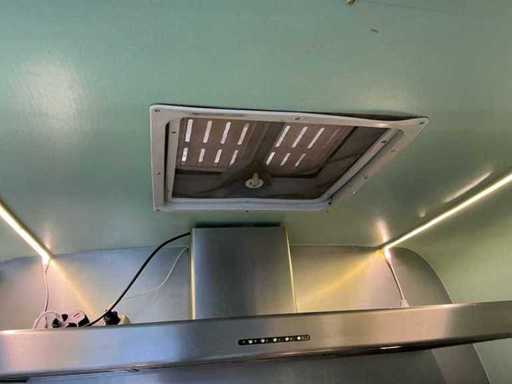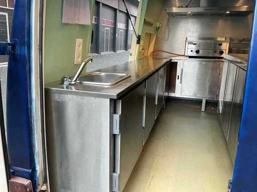 Équipé de : double air à l’aire comprimée, établi réfrigéré, 3 portes (à froid supérieur), moteur de hotte extractrice à l’intérieur, 4 brûleurs frits de 21 kW avec plaque, pas besoin de refroidir en conduisant, barbecue (hcb), eau courante avec réservoir, détecteur de fumée et CO2, 2 extincteurs, porte-reçus, on peut s’y tenir debout, poids sur la plaque d’immatriculation avec équipement, 250 cm de haut