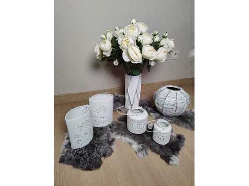 Décoration intérieure - Vases (2) - Lanternes (2) - Lumières d’ambiance (2) - Peaux de lapin (4) - Bouquets de roses artificielles