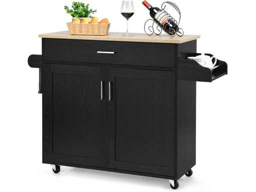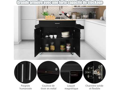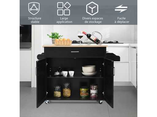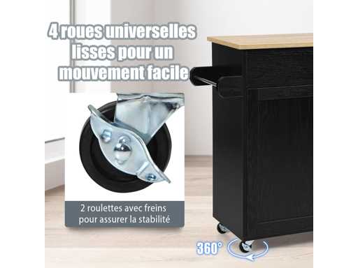 ?Déplacement facile grâce à des roulettes verrouillables:?Équipé de 4 roues universelles lisses, bîlot de cuisine peut être facilement déplacé où vous le souhaitez. Les 2 roulettes en caoutchouc sont verrouillables, permettant de maintenir l’îlot fixe, pour éviter les mouvements brusques et assurer une sécurité optimale.