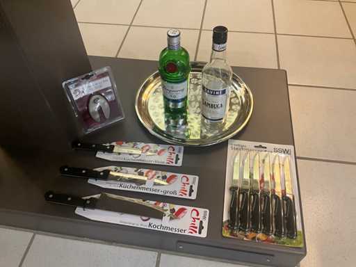 Incluant un service à whisky, divers vins, des couteaux à steak, un plat de service, des couteaux de chef avec présentation.