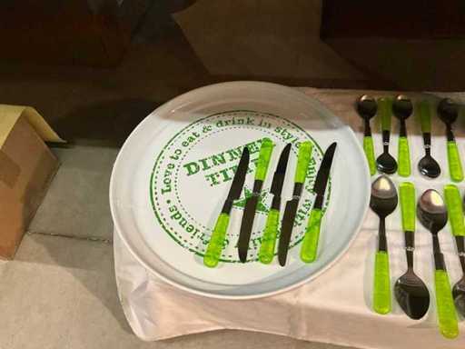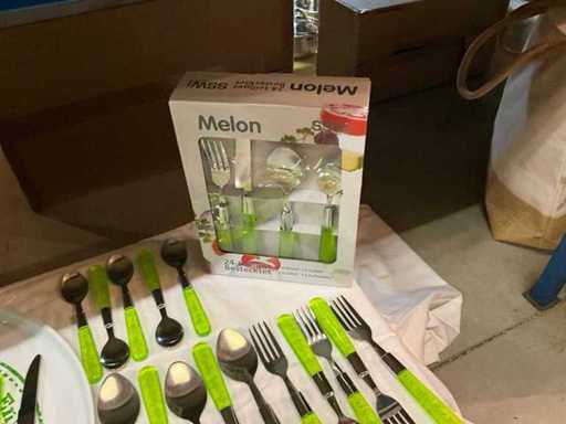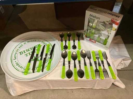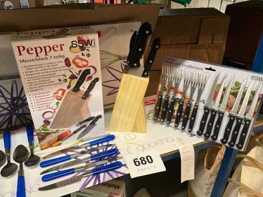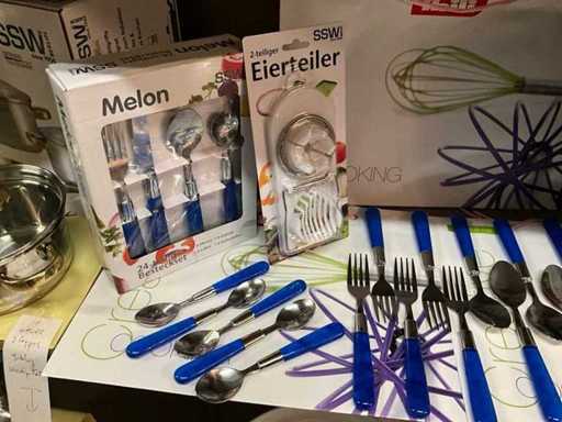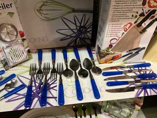 2 x 24 pièces de couverts, 1 x 7 pièces de bloc de couteaux professionnel, 1 tranche d’œuf, 1 service pizza/steak pour 6 personnes...