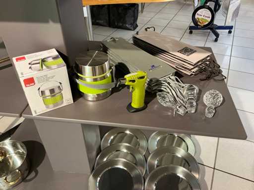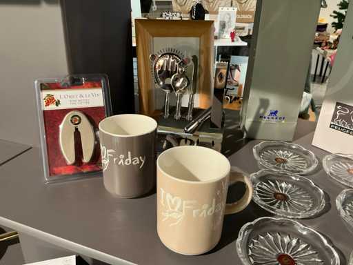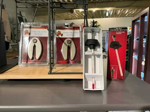 Comprenant divers accessoires à vin, dont des bouchons à vin, divers coupe-bouchons à vin, des dessous de verre, un ensemble de cocktails, un thermos à café, un briquet, 6 bols en acier inoxydable,..