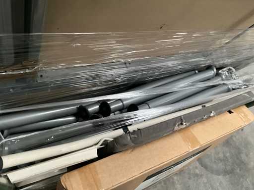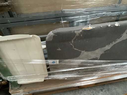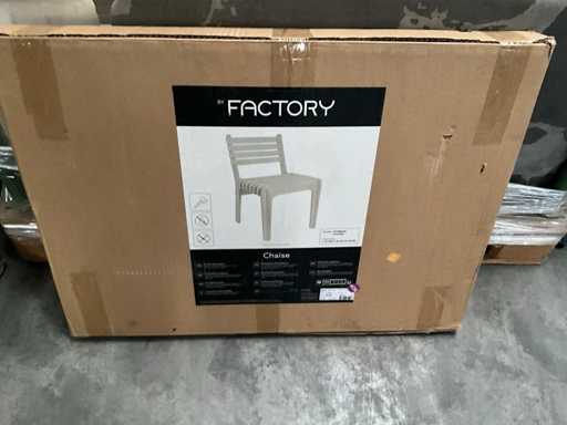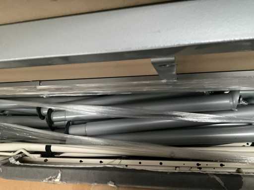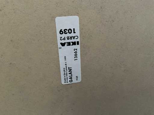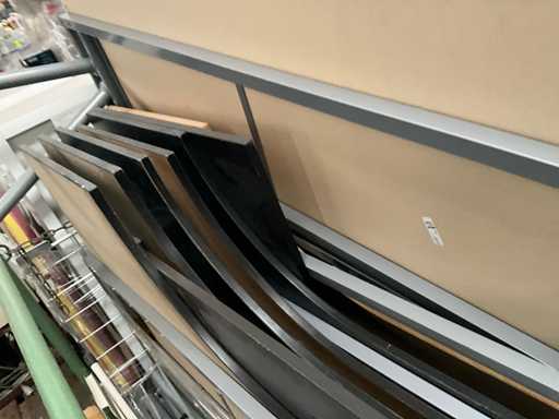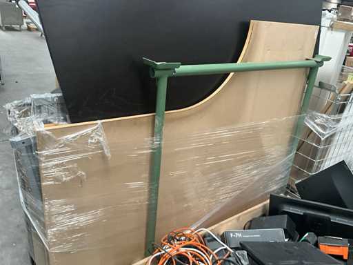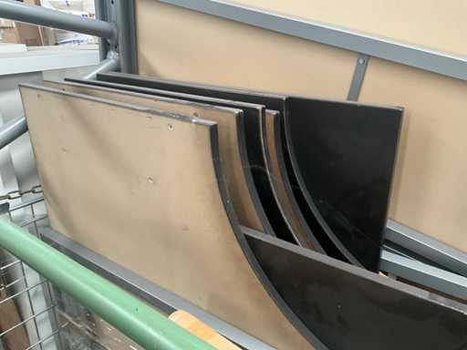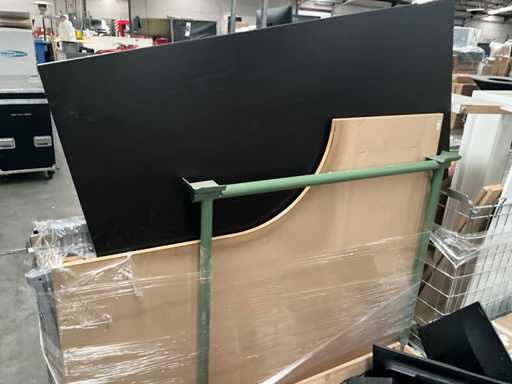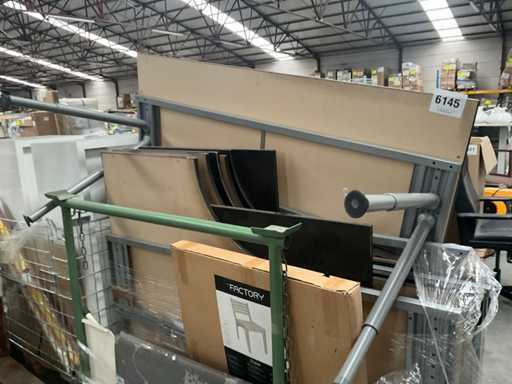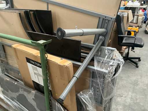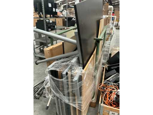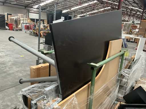 Comprenant 7 tables de bureau d’angle différentes, chacune d’environ 160 x 120 cm, à l’avant avec une forme courbée, en 2 couleurs différentes et avec une table rectangulaire de 160 x 80 cm, toutes équipées d’une base métallique, d’une chaise d’usine, d’une planche à repasser