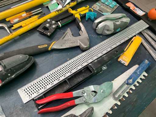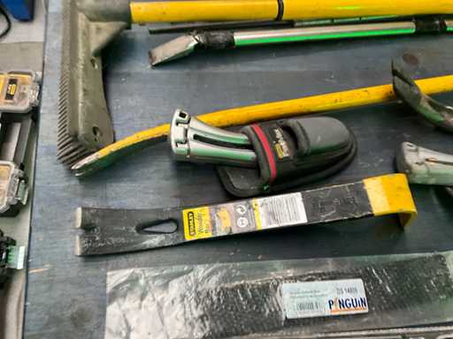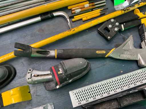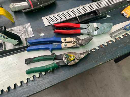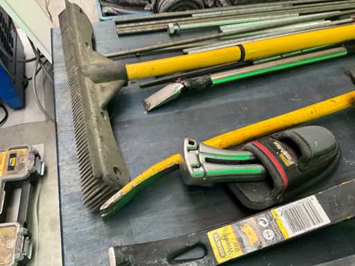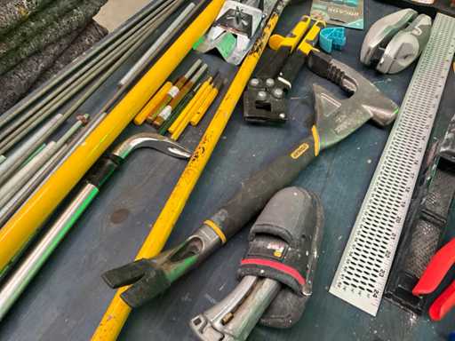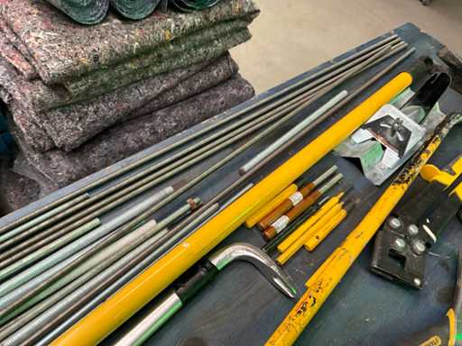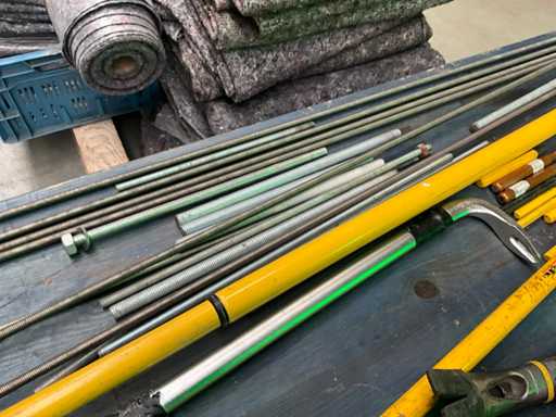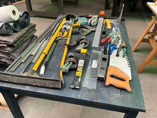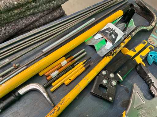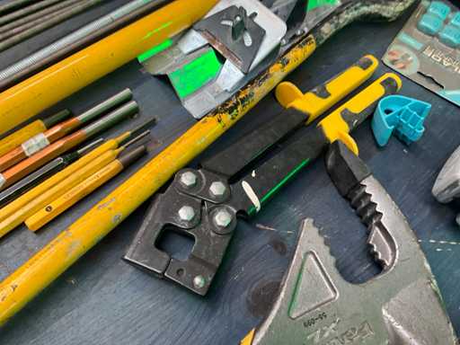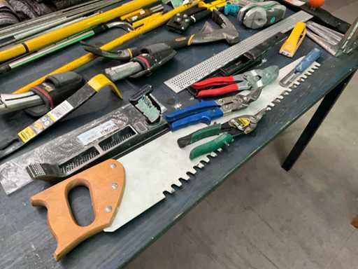 Lot comprenant des coupe-fils, une grande scie à main, une barre d’émerveillement, des tiges filetées, etc.
