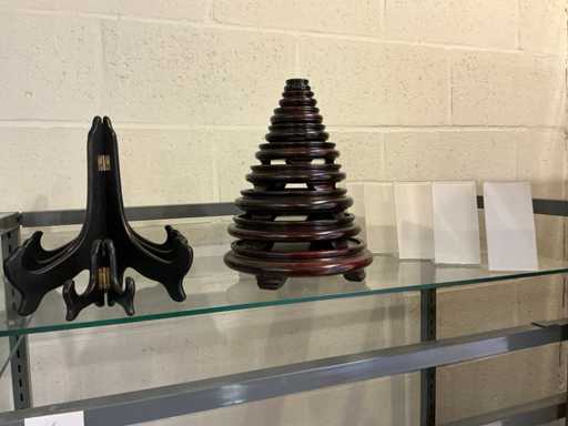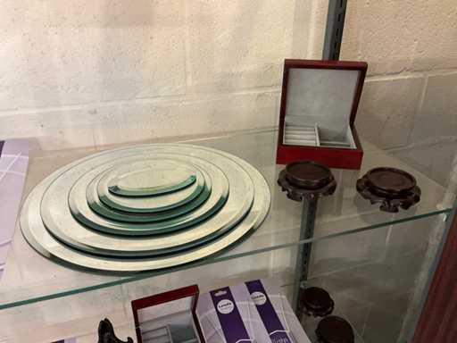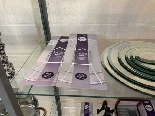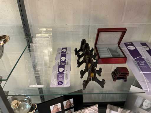 Avec 2 boîtes à bijoux, des montants en PVC et des cintres de plaques de différentes tailles, des étagères miroirs, des supports pour assiettes, des piédestaux de différents diamètres