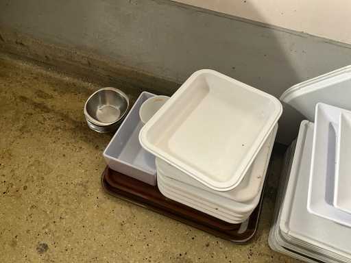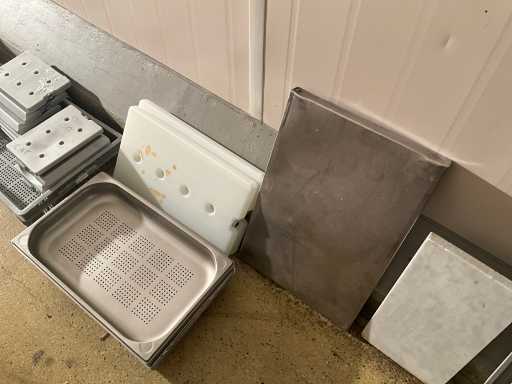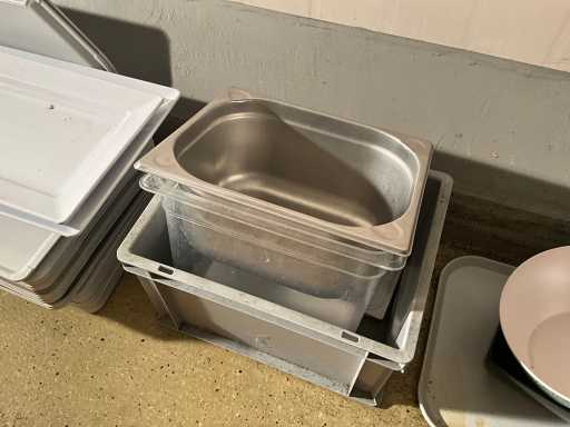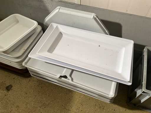 Fête de divers comprenant 40 plateaux de service principalement en version plastique, 7 plateaux gastronorm divers de 53x32x7 cm, 13 divers éléments plus frais pour KEGGY et étagère en marbre de plm: 38x22x3 cm, situé dans la salle 90