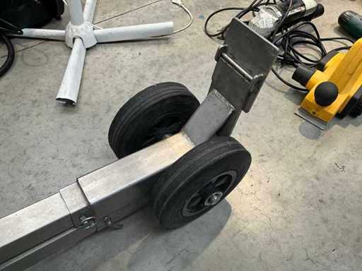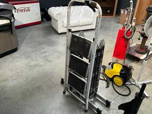 Composé d’une échelle pliante multifonctionnelle en 4 parties avec 12 barreaux, + 1 échelle pliante de 3 marches, +1x support de film, +1x roue de transport