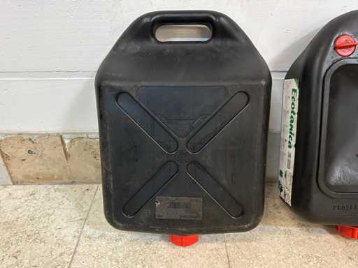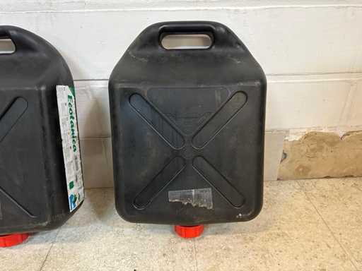 Plastique avec poignée intégrée et bouchons à vis.