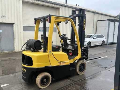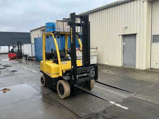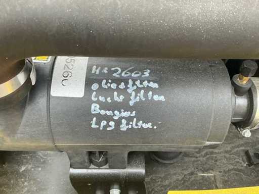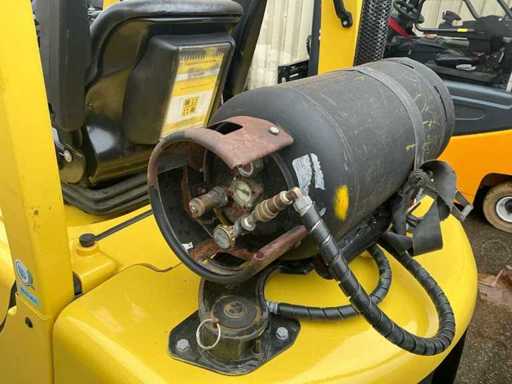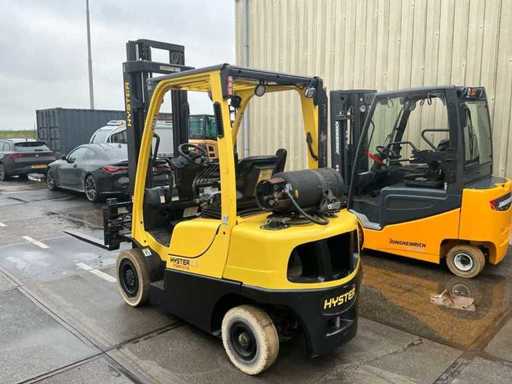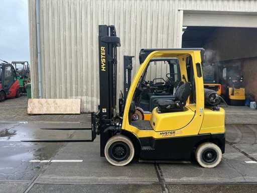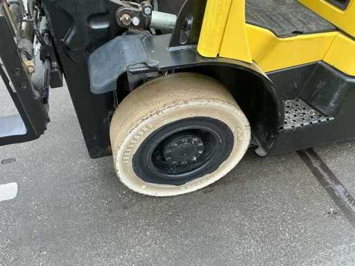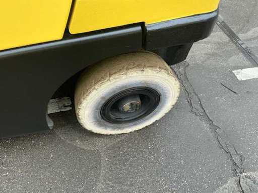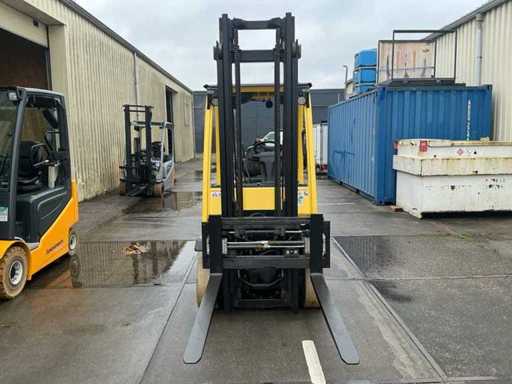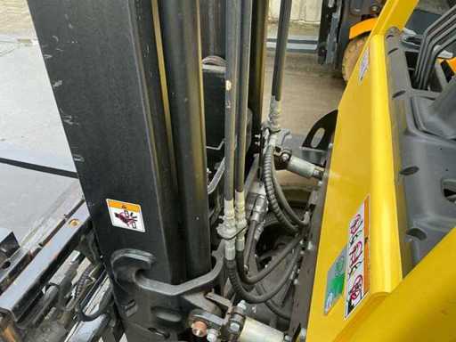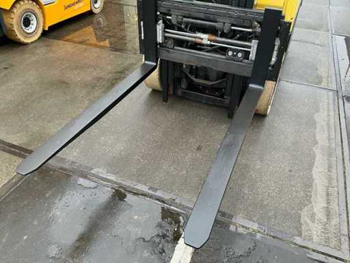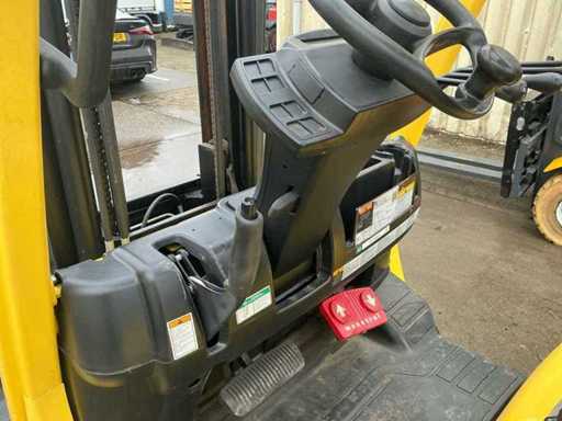Équipé de : fourches hydrauliques, mât double, levier de vitesses latéral