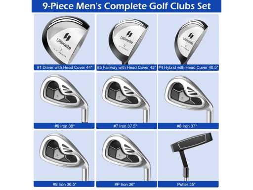 ? Ensemble complet de clubs de golf pour Hommes : Cet ensemble de clubs de golf de 9 pièces comprend un driver 1# avec couvre-tête, un fairway 3# avec couvre-tête, un hybride 4# avec couvre-tête, un fer 6#, un fer 7#, un fer 8#, un fer 9#. , fer P# et putter. Il convient aux golfeurs droitiers masculins. Remarque : le sac de golf n'est pas inclus.