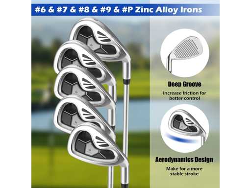 ? Fers 6# et 7# et 8# et 9# et P# avec tête en alliage de zinc : Les rainures profondes sur la surface de frappe améliore la friction pour un meilleur contrôle et une meilleure rotation. Et le dos concave est conçu pour réduire le poids et mieux absorber les chocs. Le centre de gravité bas facilite le lancement des balles et un grand sweet spot améliore la tolérance sur les coups décentrés.