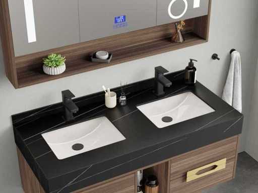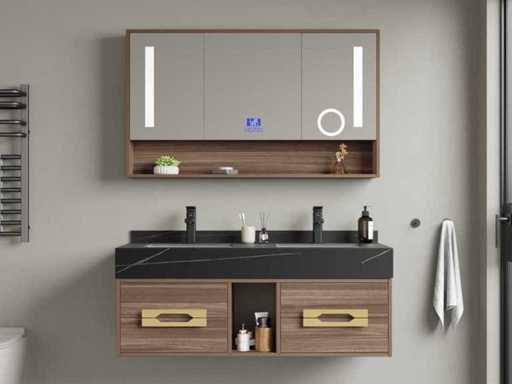 Type : MBY-312-WM. Dimensions : décor 2 personnes : 1 * Mobilier lavabo - 1200x550x430mm, 1* Armoire miroir - environ 1200x160x700mm. Équipé de : Système de tiroirs à fermeture douce : 4 tiroirs métalliques robustes - Robinets noirs incluant des drains à fenêtre (chrome) - Poignées métalliques dorées - Miroir avec : éclairage LED tactile en 3 couleurs, dimmable, horloge numérique + thermomètre, Bluetooth + haut-parleurs, technologie anti-embuée, sans cuivre - Mobilier de lavabo préassemblé.