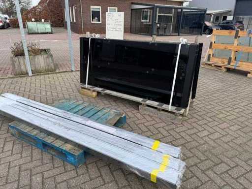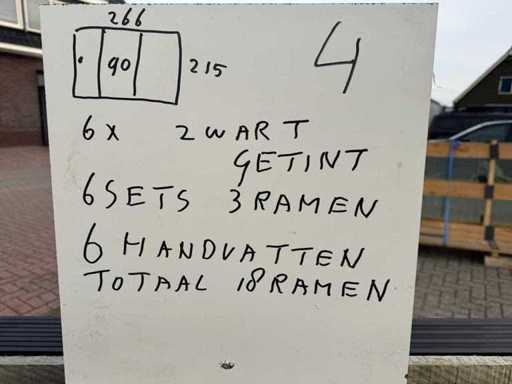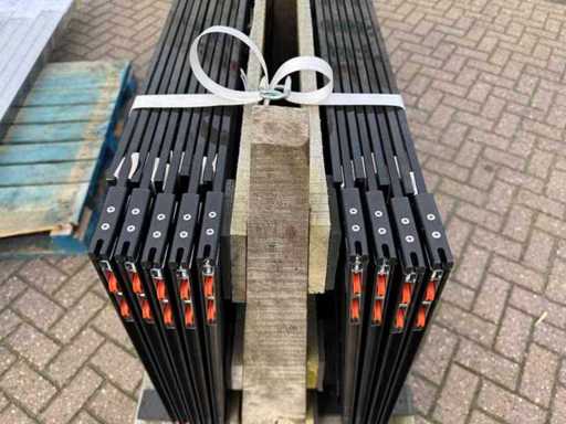 6 ensembles de 3 fenêtres coulissantes – 90 cm x 215 cm, verre teinté • Dimensions par fenêtre : largeur 90 cm, hauteur (taille jour) 215 cm • Largeur maximale de l’ensemble complet : 266 cm • Total : 18 fenêtres (6 ensembles de 3 pièces) • Matériau et couleur : cadre en aluminium noir, verre teinté • Comprend : 6 rails supérieurs et 6 rails inférieurs avec 3 rails • 6 poignées • Condition : Lot – peut contenir des traces légères ou des traces • Emballage : sur palette avec verre • Note : la photo du baldaquin est à titre d’illustration • Un chariot élévateur est disponible pour la collecte