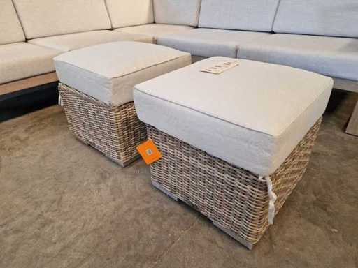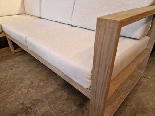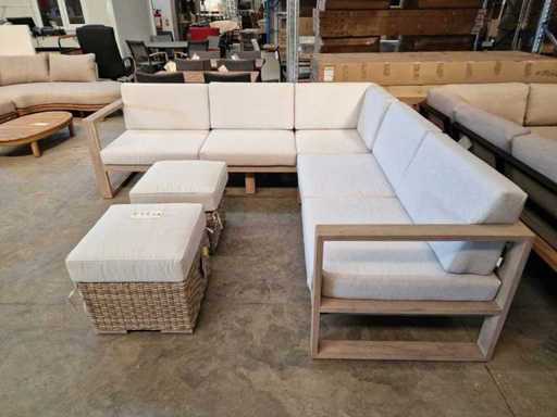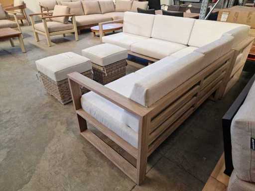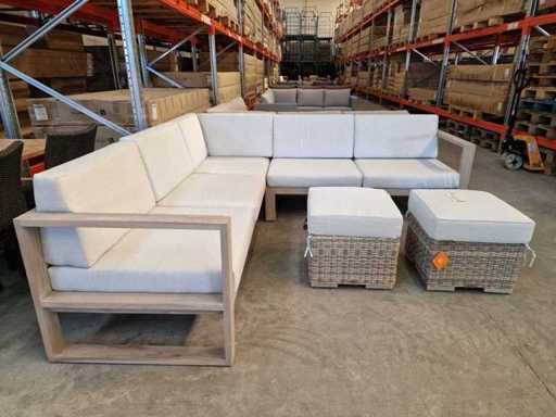 Ensemble salon Jati-Keak en teck, Hamilton Grey avec coussins, Sunbrella Light Grey 3 places + 2 places corner + Mousse à séchage rapide - coussins lavables avec fermeture éclair + 2 poufs en osier avec coussins gratuits Étanche au soleil - Neuf