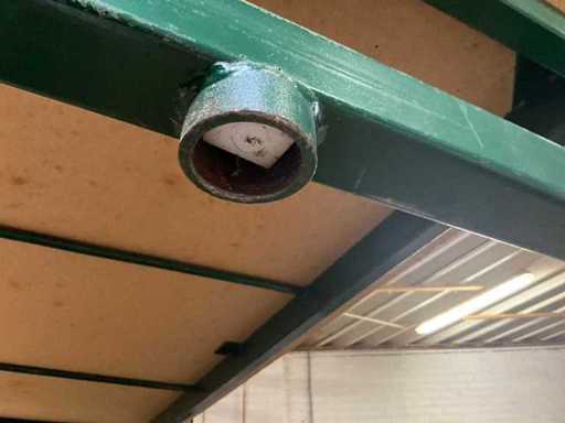 Sur une base métallique et équipée d’un toit en bois, avec seulement 2 roues fixes sur un côté court.