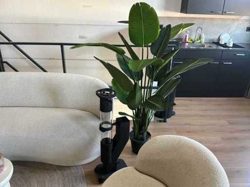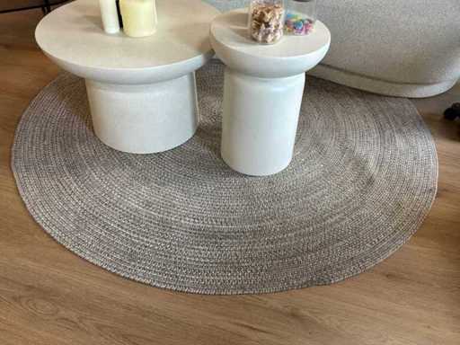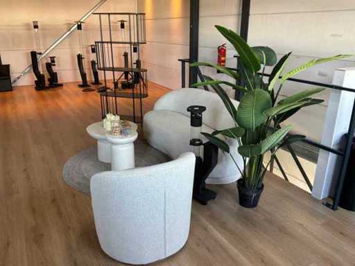 Composé d’un système de canapé pour 2 personnes (taille environ 195X70cm), 1 fauteuil, 1 plante d’intérieur, 2 tables d’appoint, 1 tapis de 160 cm, 1 meuble étagère d’environ 80x35x170cm, 1 poêle à pellets de 89cm de haut * concerne une zone de repos minimale à inutilisée