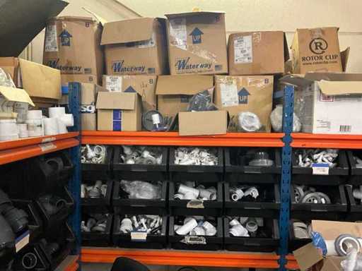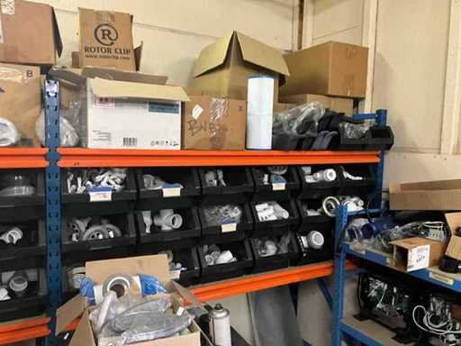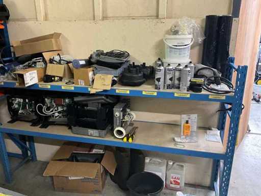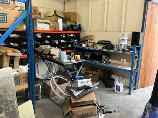 Étagère d’entrepôt à droite avec le contenu d’un grand lot de pièces détachées