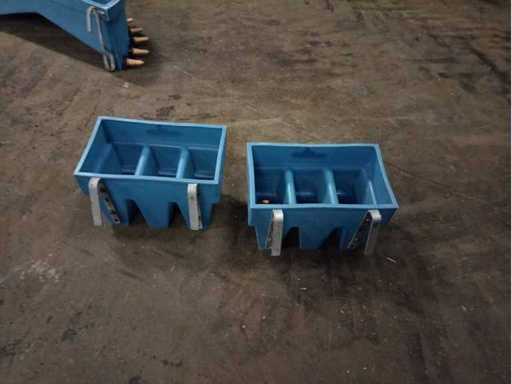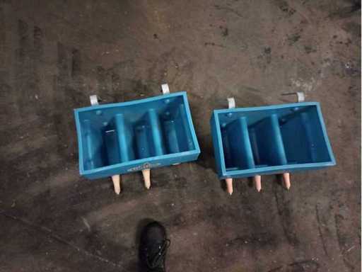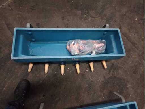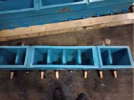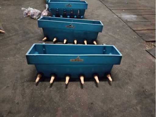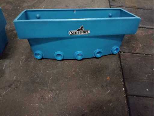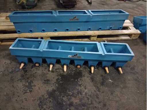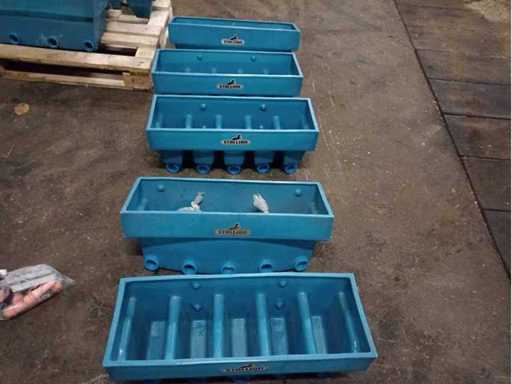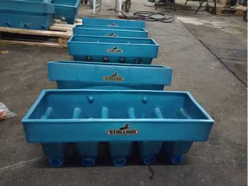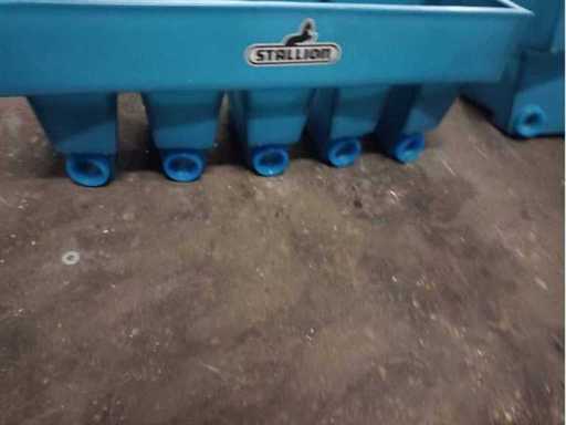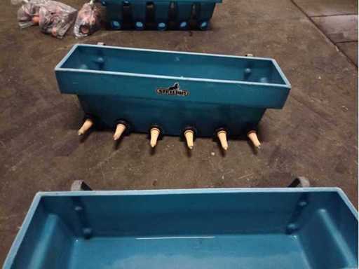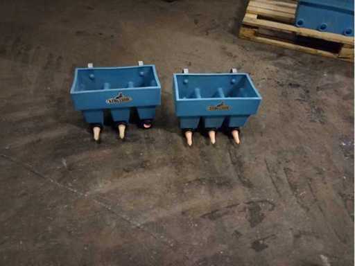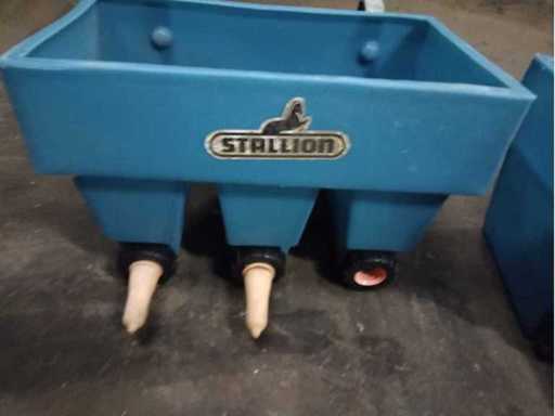 Composé de : 1 pièce Stallion FC12, 12 tétins, 80 litres (300H x 520 L x 1130 L), 5 pièces Stallion FC5, 5 tétins, 30 litres (255H x 250 L x 700 L), 2 bouffes FC6 avec 6 tétons 35 Ltres (255H x 250 L x 820L), 2 pièces Stallion MM8, 8 tétons, 40 litres (275H x 245 L x 1460L), 2 pièces Stallion MM3, 3 tétons, 16 litres (260H x 280 l x 430 l), tétons technologiques de la tétine, la téte de la pêche est réputée pour sa naturalité et est unique en ce qu’elle ne laisse pas passer plus de liquide que la mamelle d’une vache ne le ferait naturellement, permettant au veau de sucer plus intensément qu’avec les tétines traditionnelles. Cela stimule la salivation et améliore le pH de l’estomac, ce qui favorise une meilleure digestion. Les tétons stimulent la succion naturelle, permettant au veau de sucer de façon optimale, les tétons de réserve.