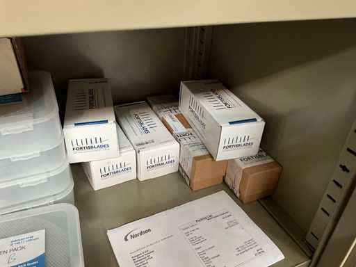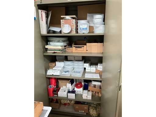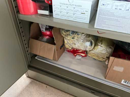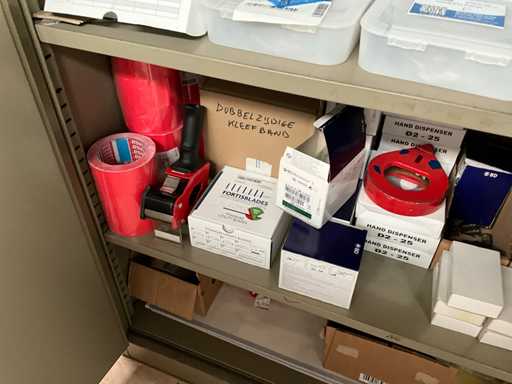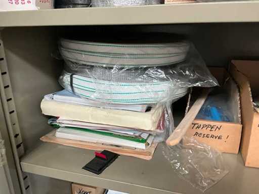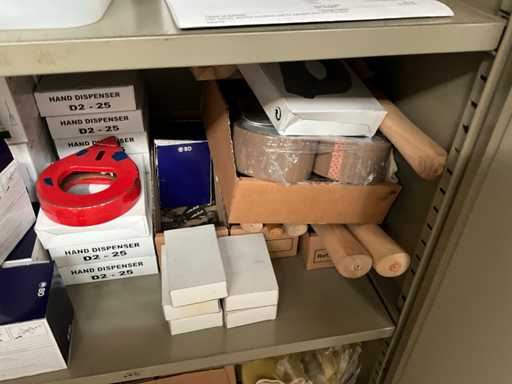 y compris l’armoire d’atelier « MEWAF » avec tout le contenu, y compris le lot de lames de rechange pour couteau utilitaire, les gants de travail, le ruban adhésif double face - supports au sol