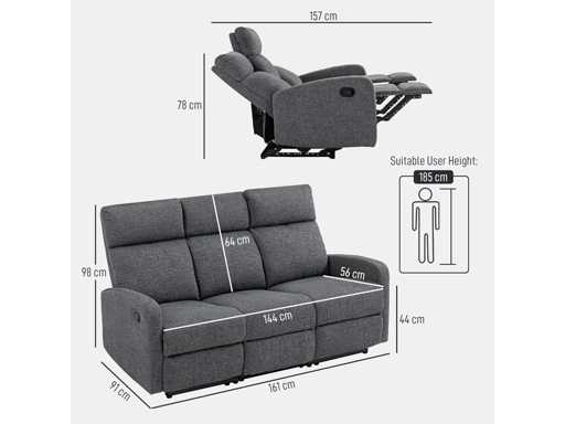 Dimensions du fauteuil inclinable : Dimensions en position assise : 161 cm (L) x 91 cm (P) x 98 cm (H) ; Dimensions en position couchée : 161 cm (L) x 157 cm (P) x 78 cm (H) ; Distance du mur (position allongée) : 45 cm ; Charge maximale : 120 kg (par siège). Appuyez sur le repose-pieds avec le talon jusqu’à ce qu’il se verrouille.