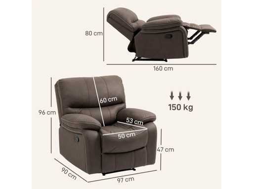 Données techniques : • Couleur : Marron • Matériaux : Tissu en microfibre, mousse de caoutchouc, acier • Tissu : 100 % polyester • Dimensions de l'assise : 97 cm (L) x 90 cm (P) x 96 cm (H) • Dimensions à plat : 97 cm (L) x 160 cm (P) x 80 cm (H) • Dimensions du siège : 50 cm (L) x 53 cm (P) x 47 cm (H) • Dimensions du dossier : 95 cm (L) x 60 cm (H) • Épaisseur du siège : 12 cm • Épaisseur du dossier : 10 cm • Dimensions de l'accoudoir : 26 cm (L) x 57 cm (P) • Hauteur des accoudoirs par rapport au siège : 18 cm • Capacité de charge : 150 kg