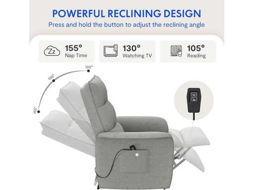 EXCEPTION DES JAMBES ET DU DOS : Notre électrique armchair adopte une technologie de jambes et de douche simultanées pour contrôler le levage et l’abaissement avec un bouton. Avec a réglage de l’angle allant de 125° à 165°, il suffit d’appuyer sur un bouton pour régler le fauteuil afin de pouvoir lire, regarder la télévision ou faire une sieste dans une position confortable.