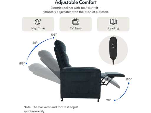 AJUSTEMENT DES JAMBES ET DU DOS : Notre fauteuil électrique adopte une technologie de réglage simultané des jambes et du dos pour contrôler le levage et l’abaissement avec un bouton. Avec une large gamme de commandes d’angle de 125°-165°, vous pouvez vous asseoir, vous allonger ou dormir à votre guise en un seul clic, et faire ce que vous voulezsur le fauteuil.