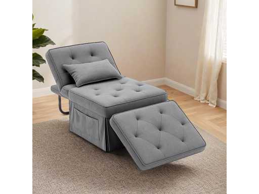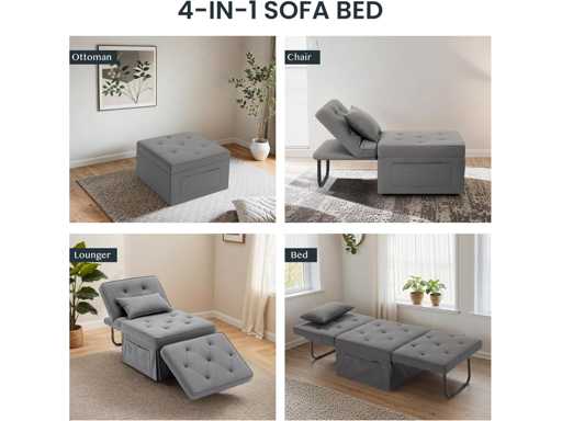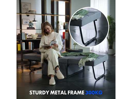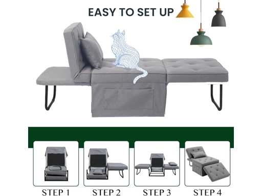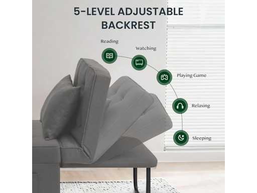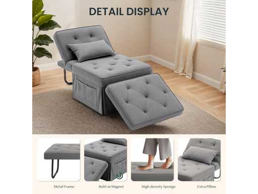ans des circonstances normales. Il peut être facilement et rapidement transformé en canapé, chaise longue ou lit pour répondre à vos différents besoins multifonctionnels sans vous soucier des invités inattendus. Parfait pour les petites pièces, dortoirs, appartements, studios, bureaux. ADAPTÉ À TOUTES LES SCÈNES: Le fauteuil-lit est simple et élégant avec un design pliant unique, occupant moins de place, facile à nettoyer et à entretenir. DOSSIER RÉGLABLE SUR 5 POSITION : grâce au mécanisme à clic, le dossier peut être ajusté en douceur sur 6 positions, ajoutant plus de flexibilité pratique à la polyvalence. Vous offrant des possibilités pour toutes les activités familiales, de la position assise à la position allongée. ASSISE REMBOURRABLIE EN MATIÈRE RESPIRATOIRE : Ce canapé-lit pliable est entièrement rembourré de mousse haute densité de qualité supérieure, qui offre confort et qualité. La structure en acier robuste supporte de manière stable une charge maximale de 300 kg. De plus, le revêtement en tissu de lin du canapé-lit individuel est respirant et doux pour la peau. AUCUN ASSEMBLAGE REQUIS : Ce lit de repos étant pliable, aucun assemblage n'est requis. Retirez le repose-pieds et préparez-le à l'utilisation. Instructions faciles à suivre incluses pour vous aider à modifier avec succès vos meubles. Les patins antidérapants sur les pieds permettent à l'ensemble du canapé de mieux adhérer au sol et de maintenir l'équilibre.