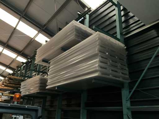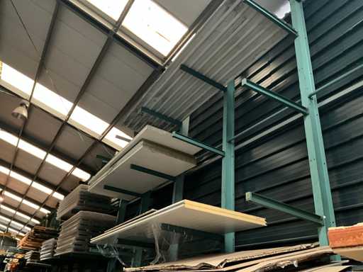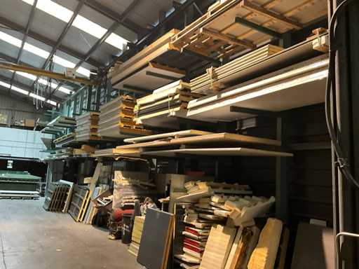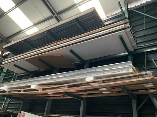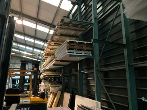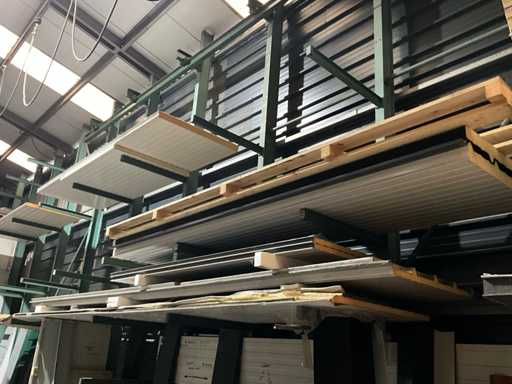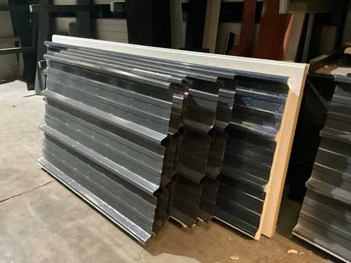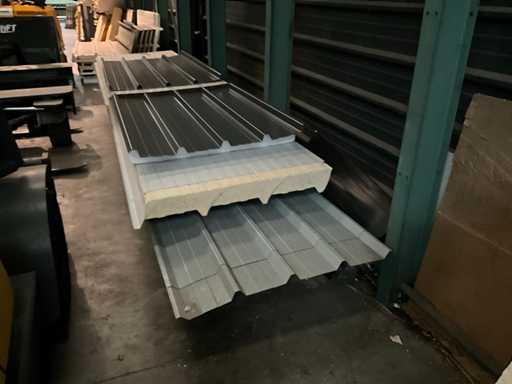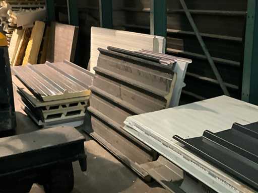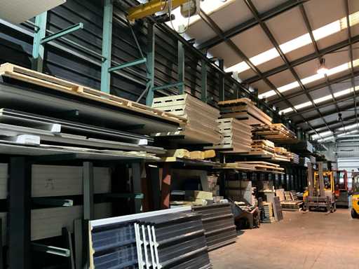 Composé d’un grand lot de divers panneaux de toit isolés et non isolés, panneaux translucides, murs isolés, etc..., tous situés en rack cantilever (non inclus) sur le côté droit du bâtiment et au sol