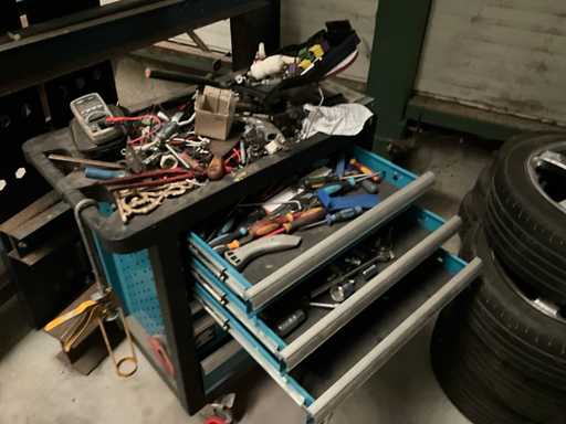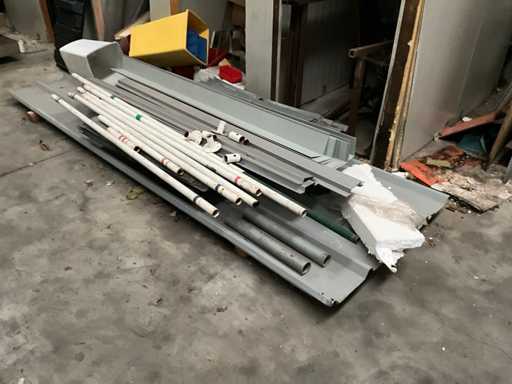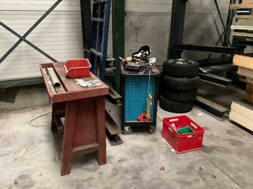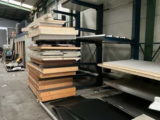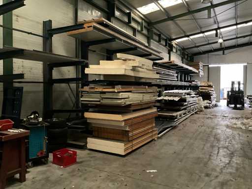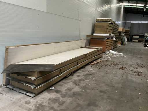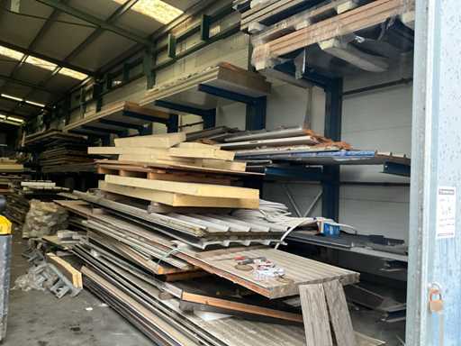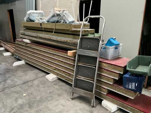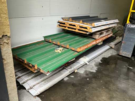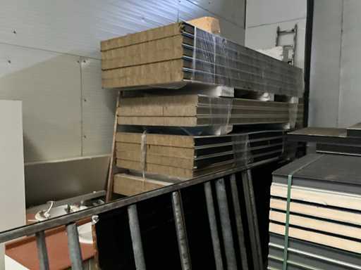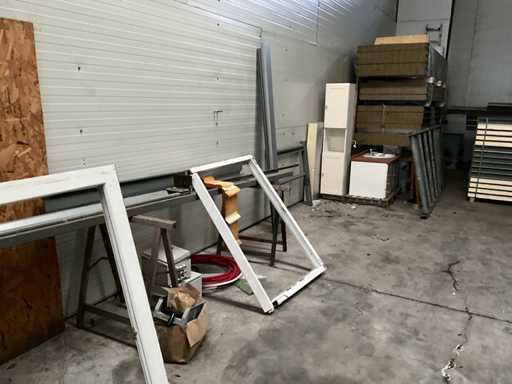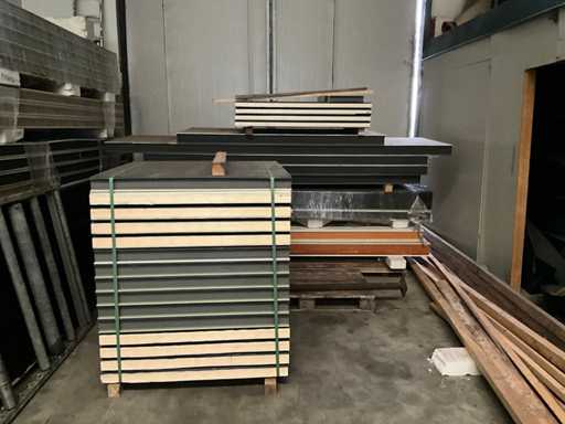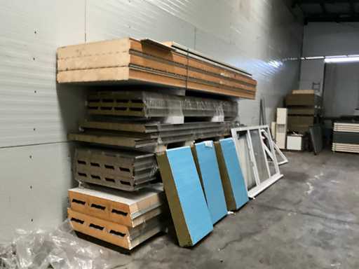 Composé d’un grand lot de divers panneaux de toit isolés et non isolés, de murs isolés, d’un chariot de matériaux avec contenu, d’un établi, de pneus sur jante, de tôles peintes, etc., tous situés dans un rack en porte-à-faux (rack en porte-à-faux non inclus !!) et sur le sol, situé dans le bâtiment à l’arrière droit n° 3