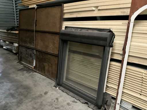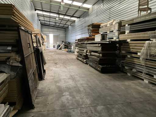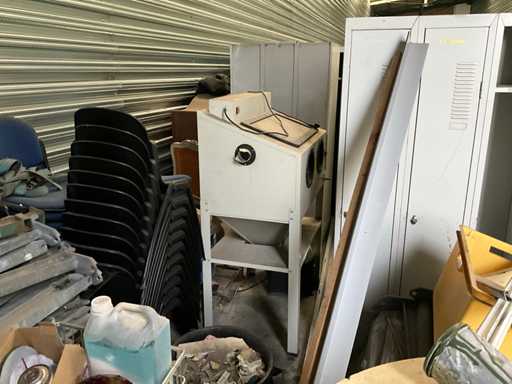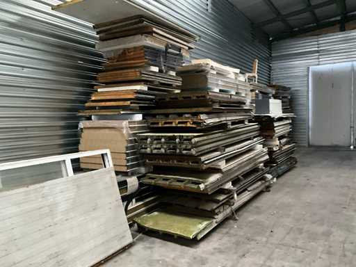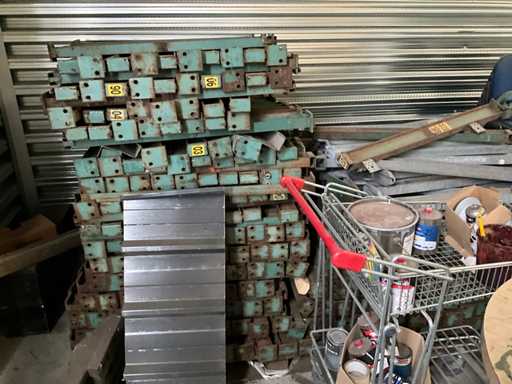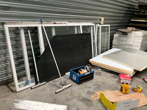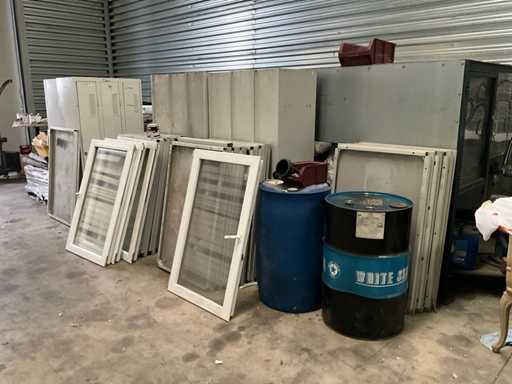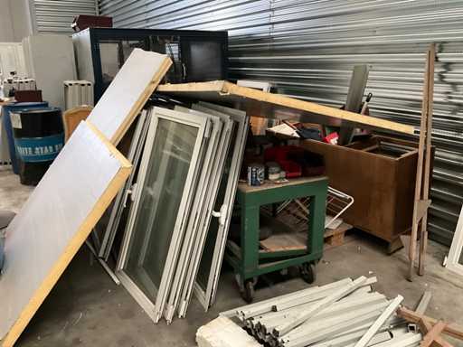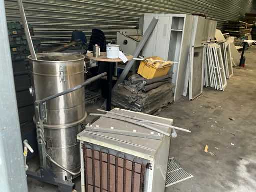 Composé d’un grand lot de divers panneaux de toit isolés et non isolés, de murs isolés, d’un appareil de sablage, d’environ 8 armoires de casiers en tôle d’acier à 3 portes, de fenêtres en PVC, d’environ 20 chaises de cantine, d’un grand lot de poutres de rack en porte-à-faux, d’un baril d’aspirateur en acier inoxydable, d’un support de roll-off pour plaque de zinc sur un rouleau, d’un chargeur Claas 300E avec fonction boost, d’un réservoir sous pression de 50 litres pour compresseur, d’un chariot de supermarché avec contenu, de tôles peintes etc..., tout est sur le sol, Situé dans le bâtiment à l’arrière gauche n° 2