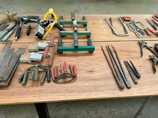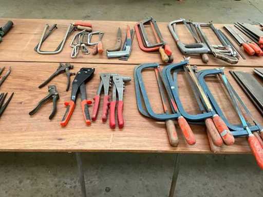 Composé de carrés, de perceuses manuelles, de poignées pour transporter des assiettes, de pinces à rivets aveugles, de scies à métaux, de scies à hores, etc.