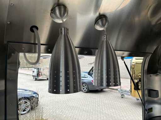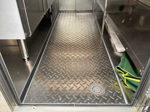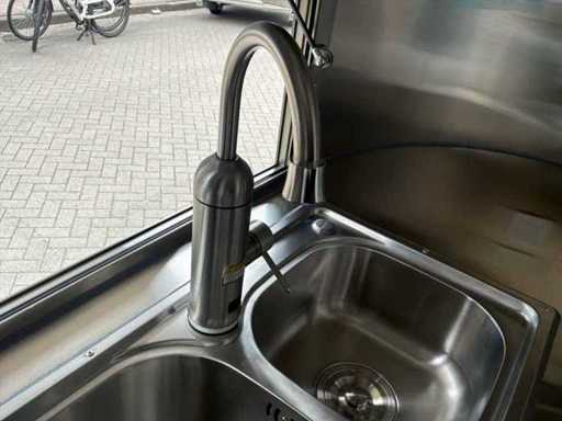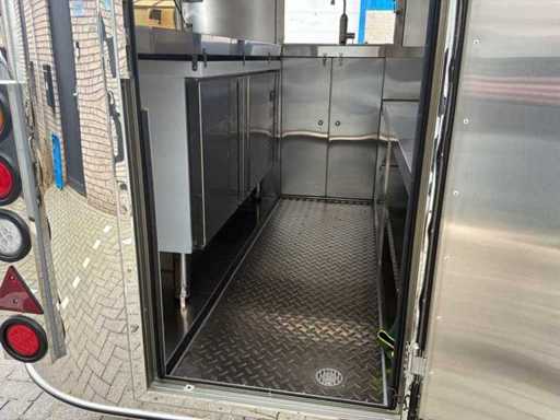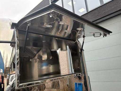 Adapté au permis de conduire B * équipé d’un établi réfrigéré avec fonction congélateur, de 2 éviers avec robinet d’eau chaude et froide, d’un réservoir d’eau propre et sale, d’une hotte extractrice de 1,3 mètre de large, d’un éclairage complet et de prises 230V tout autour, connexion principale 230V 16A, y compris les documents nécessaires * sur une base européenne approuvée