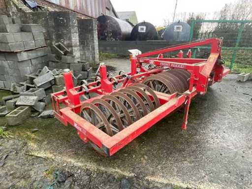 Rouleau frontal HE-VA Front Pakker 400 destiné au rappui et au nivellement du sol. Équipé d’un rouleau à anneaux métalliques lourds et de dents à ressort à l’avant, permettant une bonne préparation du lit de semence. Construction robuste adaptée à une utilisation agricole professionnelle, en combinaison avec un outil arrière.