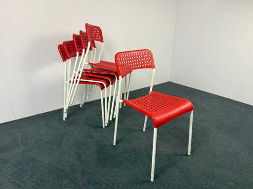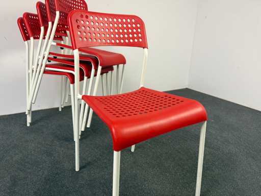 Ensemble de 18 fauteuils de cantine empilables IKEA avec siège et dossier en plastique rouge sur quadruples blanches pour une combinaison de couleurs ludique. L’état peut varier selon l’élément de l’ensemble.